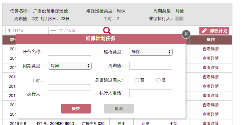 建立景區(qū)設(shè)施設(shè)備維保任務(wù),包括時間、周期、計劃等。