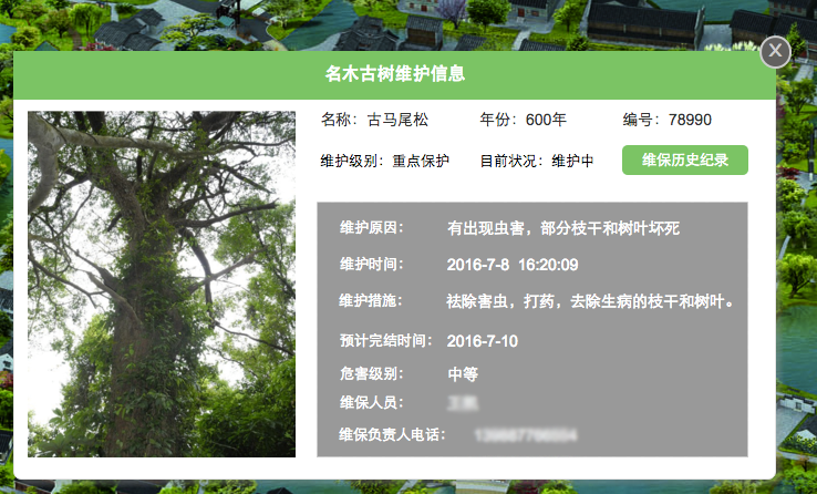 結(jié)合GIS地圖,實(shí)時展示每一個設(shè)備的正在維保維修中的信息,維保人員根據(jù)維保任務(wù)計劃周期時間,定時為景區(qū)設(shè)施設(shè)備進(jìn)行巡檢和維護(hù)。同時也能查看每一個設(shè)備的維保歷史記錄,以及正在維保的狀態(tài)跟蹤。