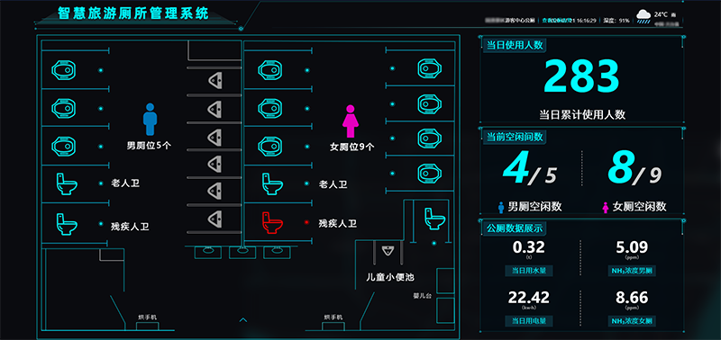 智能廁所系統基于4G、WIFI等無線通信技術,通過智能網關、無線設備,無線采集設備無線連接及控制設備,搭載相應的設備,如顯示屏、攝像頭、溫濕度傳感器、氣體傳感器一鍵告警、智慧照明等數據傳至云平臺,創建公廁管理數據庫,實現公廁環境、能耗、運維等方面的實時監管平臺,為實現公廁的智能化應用管理提供數據支撐。