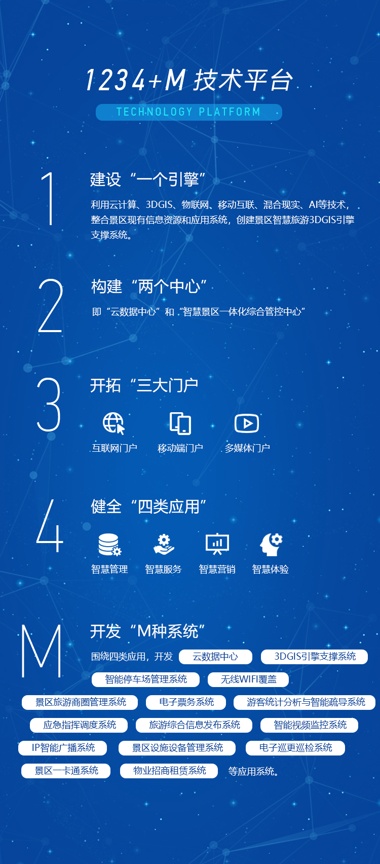 云野科技結(jié)合多年智慧景區(qū)建設(shè)經(jīng)驗及自身研發(fā)的成熟產(chǎn)品,緊緊圍繞“智慧管理、智慧服務(wù)、智慧營銷與智慧體驗”四類應(yīng)用,通過“1234+M”技術(shù)平臺的實施,實現(xiàn)景區(qū)智慧旅游建設(shè)目標。
