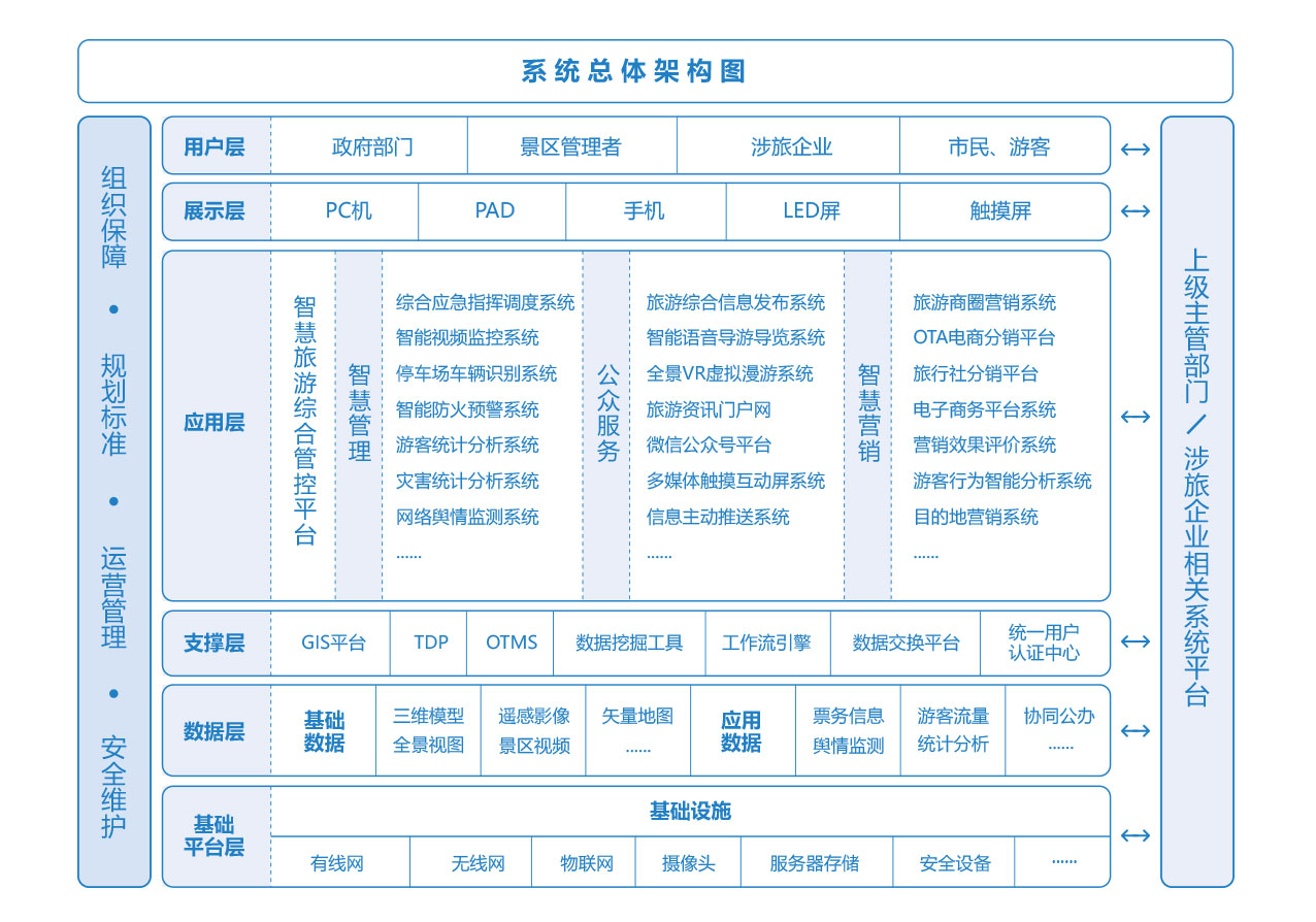 以云數(shù)據(jù)中心平臺為基礎(chǔ),以地理信息GIS平臺為支撐,以組織保障、標準規(guī)范、運維管理與安全保障為后盾,從綜合管理、游客服務(wù)與旅游營銷三大層面入手,采用互聯(lián)共享、融合提升和科學(xué)管理的先進設(shè)計理念,逐步建立起特色鮮明、運轉(zhuǎn)高效的智慧旅游管理體系、服務(wù)體系和營銷體系。