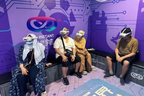 在上海影視樂園黃河路內,“元宇宙XR全感影院”瞬息魔方項目試運營首日即吸引2000余名游客爭相打卡。體驗者們佩戴輕量化XR設備,在虛實交融的沉浸空間中穿越星際、探秘深海,通過多維度體感反饋與視覺奇觀開啟“五感全開”的次元冒險。開業至今,其新奇體驗迅速圈粉——周末高峰時單日體驗人數超300人,從開館到閉館,熱門主題設備幾乎一直在運行。候場區常坐滿等候的游客。已有多名外國游客前來體驗,用不太流利的中文連說“太厲害了”。