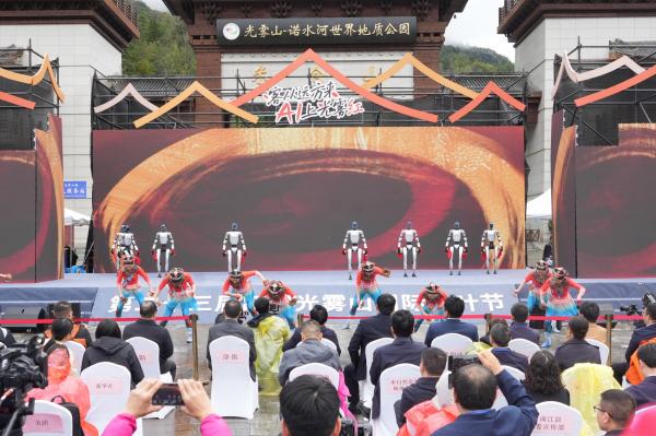 10月18日,第二十三屆四川光霧山國際紅葉節開幕式上,多臺機器人與舞蹈演員同臺演繹國家級非遺《翻山鉸子》。金屬機械臂隨傳統韻律翻飛,與演員的靈動舞姿相映成趣,剛勁的非遺動作與科技感十足的機械運轉完美融合,瞬間點燃現場氛圍。